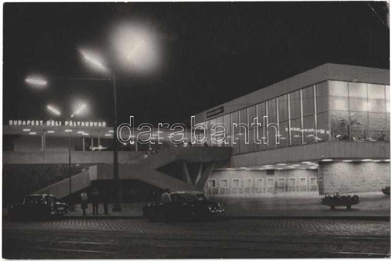 Beschreibung: Budapest I. Déli pályaudvar, vasútállomás este, automobilok. Képzőművészeti Alap Kiadóvállalat (EK)