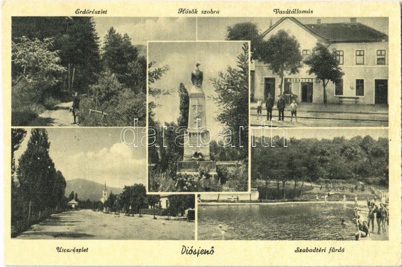 Beschreibung: Diósjenő, Erdőrészlet, Hősök szobra, vasútállomás, utcarészlet, szabadtéri fürdő