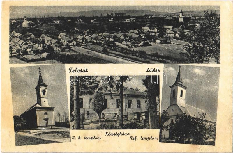 Beschreibung: Felcsút, Látkép, községháza, római katolikus templom, református templom (fl)