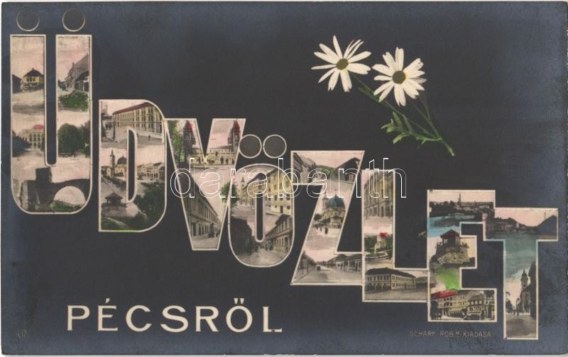 Beschreibung: Pécs, Üdvözlet Pécsről! Virágos üdvözlőlap városi részletekkel. Scharf Róbertné kiadása
