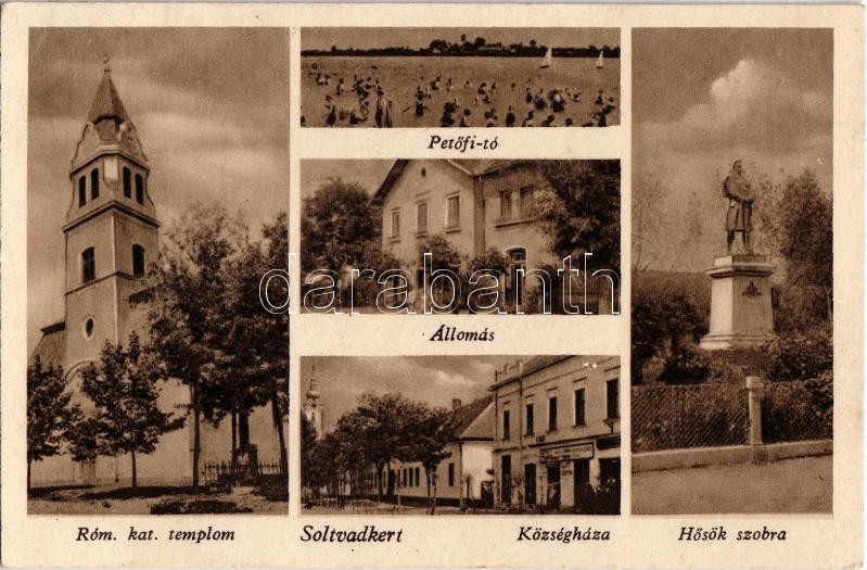 Beschreibung: Soltvadkert, Római katolikus templom, Petőfi tó, strand, fürdőzők, Vasútállomás, Községháza, Hősök szobra, emlékmű. Kiadja Genedits Pálné