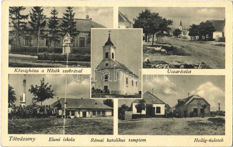 Beschreibung: Tótvázsony, községháza, hősök szobra, elemi iskola, Római katolikus templom, utca, Heilig üzletek. Heilig Lőrinc kiadása