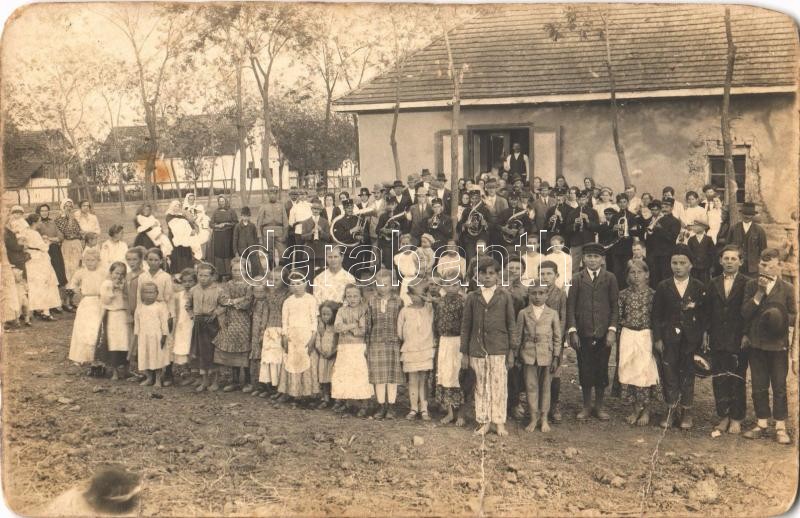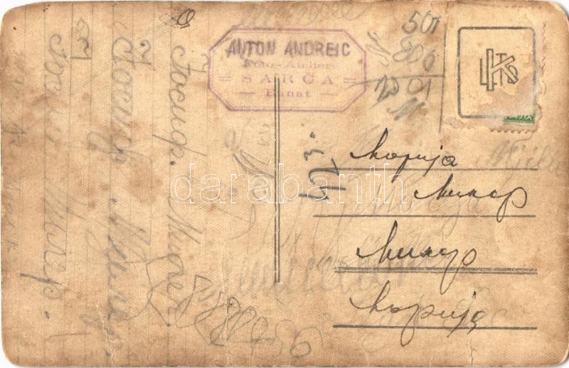 Szárcsa, Sartscha, Sarca, Sarcia, Sutjeska; Fő utca, gyerekek és katonák csoportképe, katonai zenekarral / main street, children and soldiers group picture with military music band. Anton Andreic photo (vágott / cut)