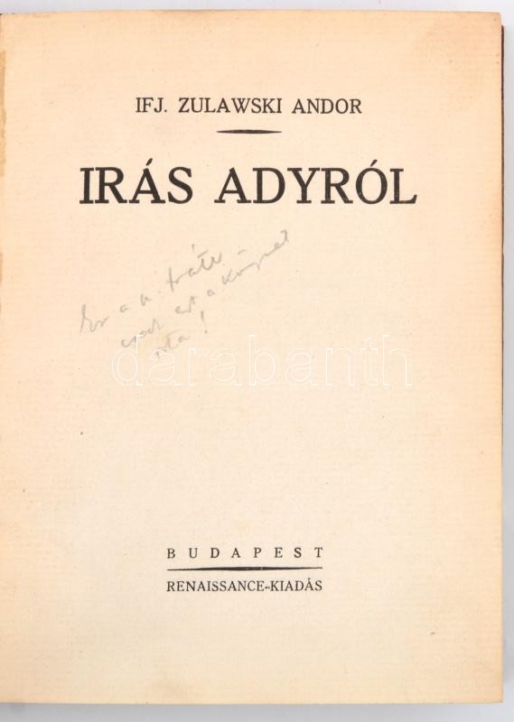 Ifj. Zulawski Andor: Írás Adyról. Bp., é.n., Renaissance, 160 p. Átköt... https://www.darabanth.com/de/363-Fernauktion/363.0/Bucher/Bucher-Andere-kuriositaten~1000018/Ifj-Zulawski-Andor-Iras-Adyrol-Bp-en-Renaissance-160-p-Atkotott-kisse-kopott-felv~II2097381