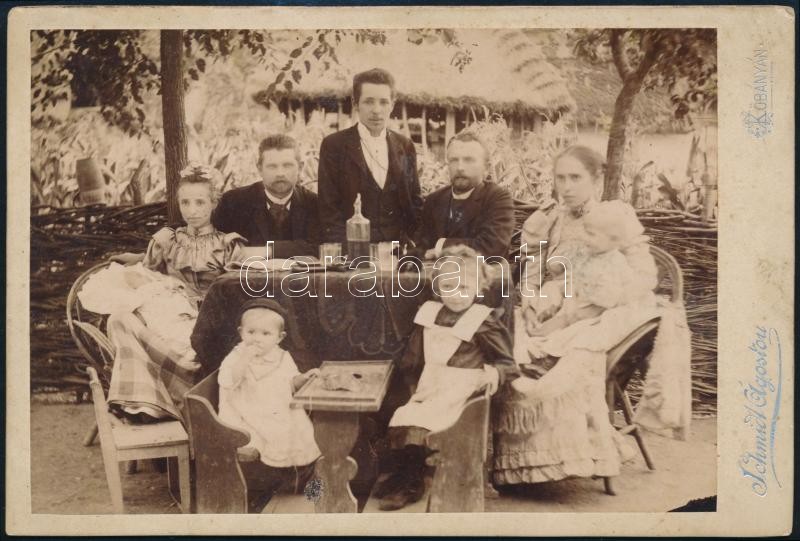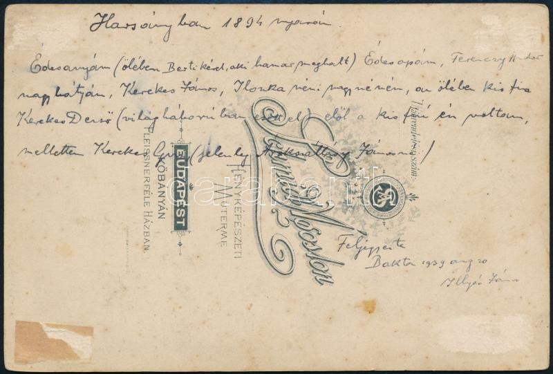 Beschreibung: 1895 Illyés János családja Harsányban, keményhátú fotó Schmidt Ágoston műterméből, 11×16,5 cm