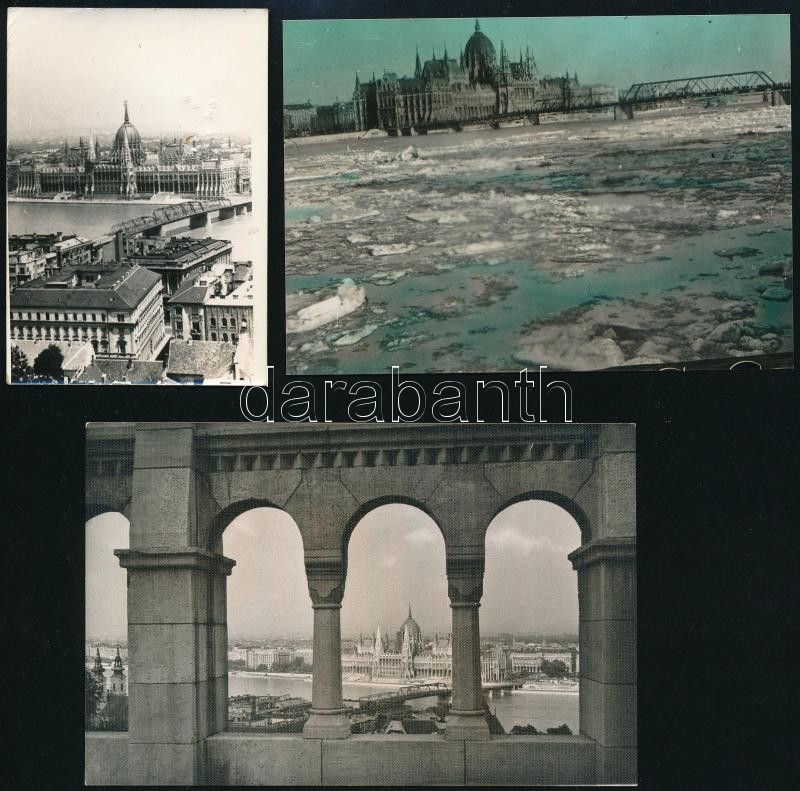 cca 1957 Budapest, a Kossuth híd különféle nézőpontokból, 4 db fotó, ebből 3 fénykép vintage, egy pedig mai nagyítás korabeli színes diapozitív felvételről, 9x6 cm és 8,1x21 cm
