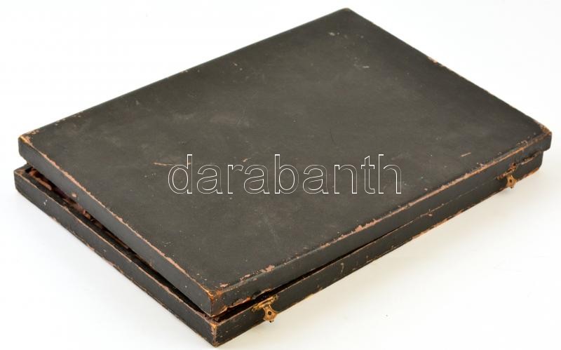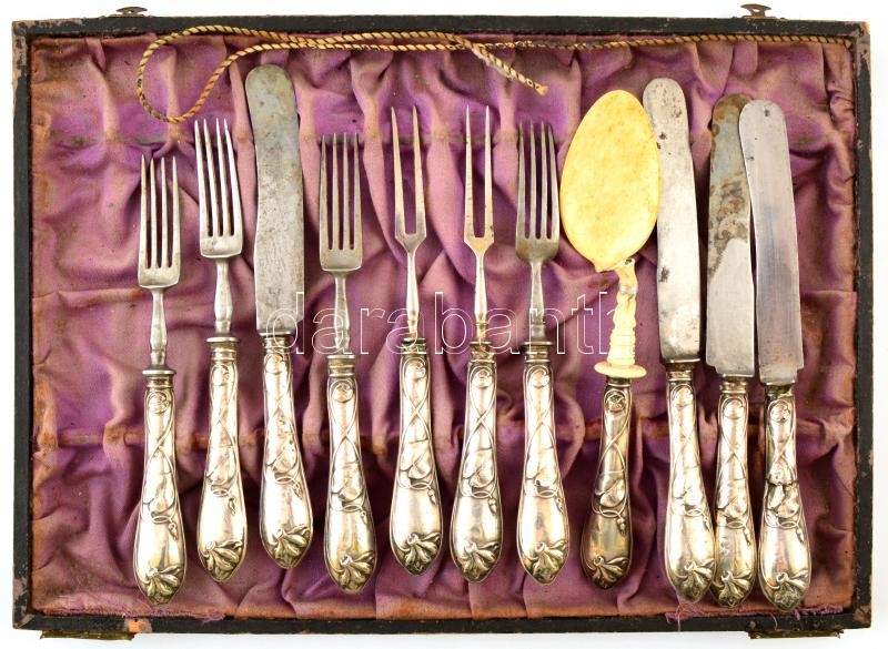 Beschreibung: Ez (Ag.) nyelű szecessziós hiányos evőeszköz készlet, törött (ragasztott) csont kanál, horpadásokkal, hibás dobozban, összesen: 9 db