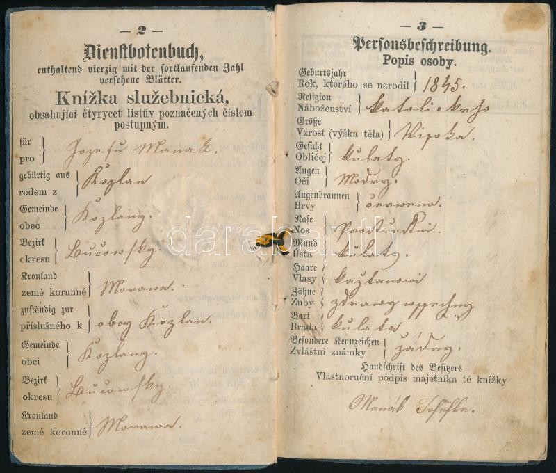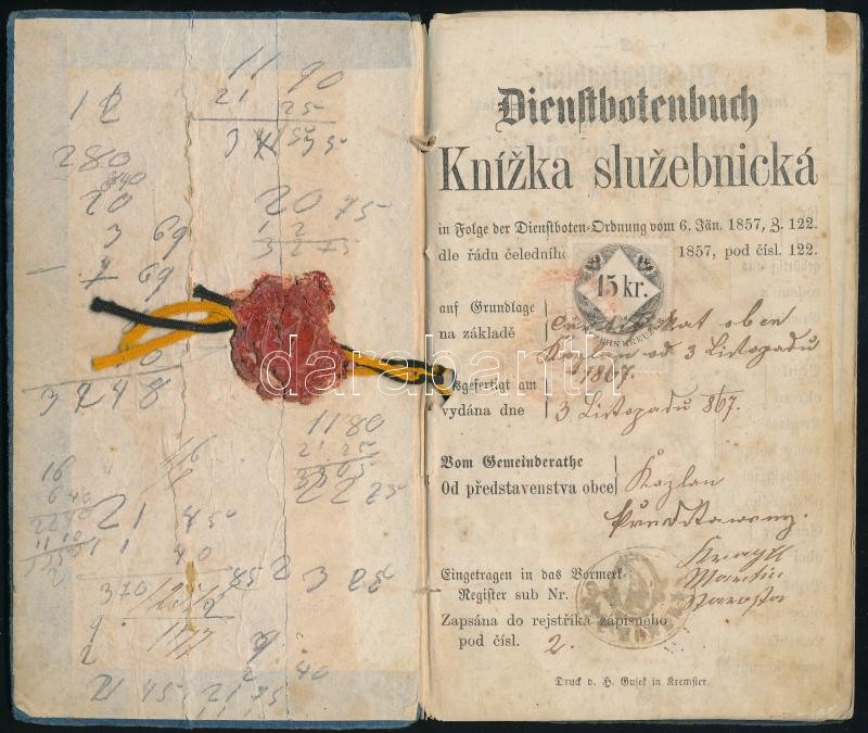 1867 Kétnyelvű cselédkönyv 15 Kr okmánybélyeggel https://www.darabanth.com/de/363-Fernauktion/363.0/Kunst-Dokumente-andere-Sammelgebiete/Dokument~500018/1867-Ketnyelvu-cseledkonyv-15-Kr-okmanybelyeggel~II2096640