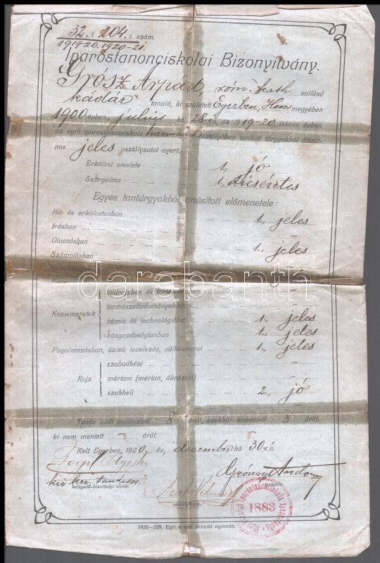 1920 Eger, iparostanonciskolai bizonyítvány https://www.darabanth.com/de/363-Fernauktion/363.0/Kunst-Dokumente-andere-Sammelgebiete/Dokument~500018/1920-Eger-iparostanonciskolai-bizonyitvany~II2080916