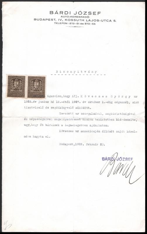 Beschreibung: 1929 Bp. IV., Bárdi József Autókereskedő által kiállított munkáltatói igazolás okmánybélyegekkel, Bárdi József által aláírva