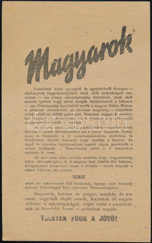 Beschreibung: 1944 "Magyarok tőletek függ a jövő!" - szövetségesek által kiadott, németellenes röplap