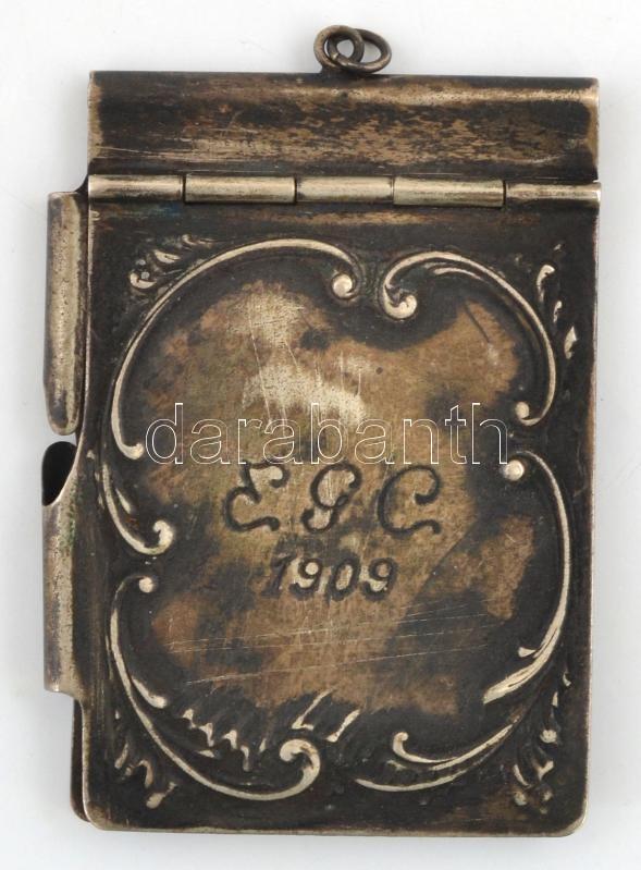 Beschreibung: "EGC 1909" feliratú, fém táncrend tartó, jelzett(Orfevrerie Wiskemann Bruxelles&Zurich), kopott, 8x5,5 cm