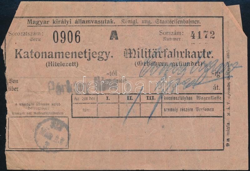 cca 1912 Magyar Királyi Államvasutak katonamenetjegy https://www.darabanth.com/de/363-Fernauktion/363.0/Kunst-Dokumente-andere-Sammelgebiete/Militaria~500028/cca-1912-Magyar-Kiralyi-Allamvasutak-katonamenetjegy~II2096590