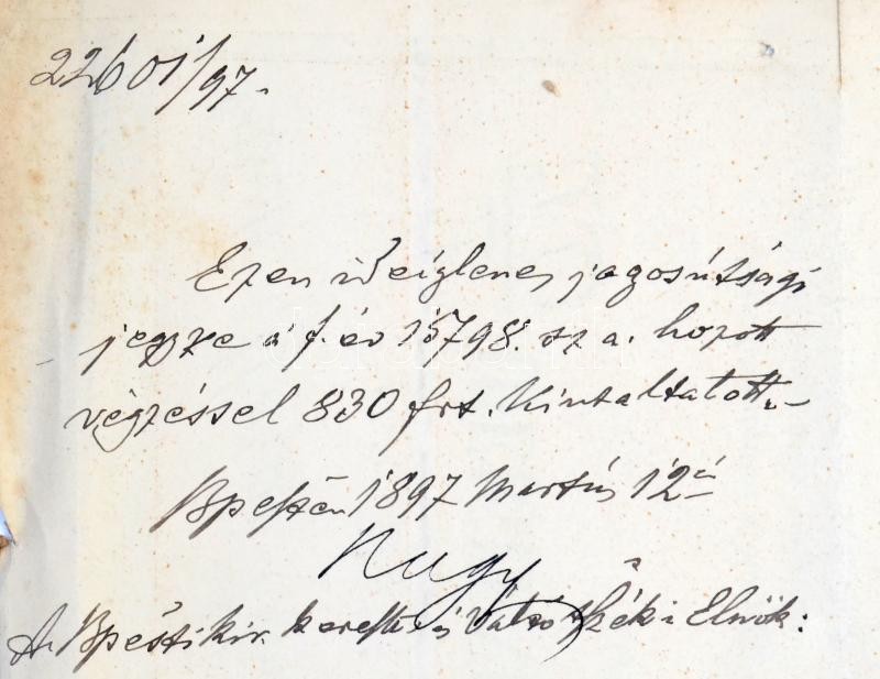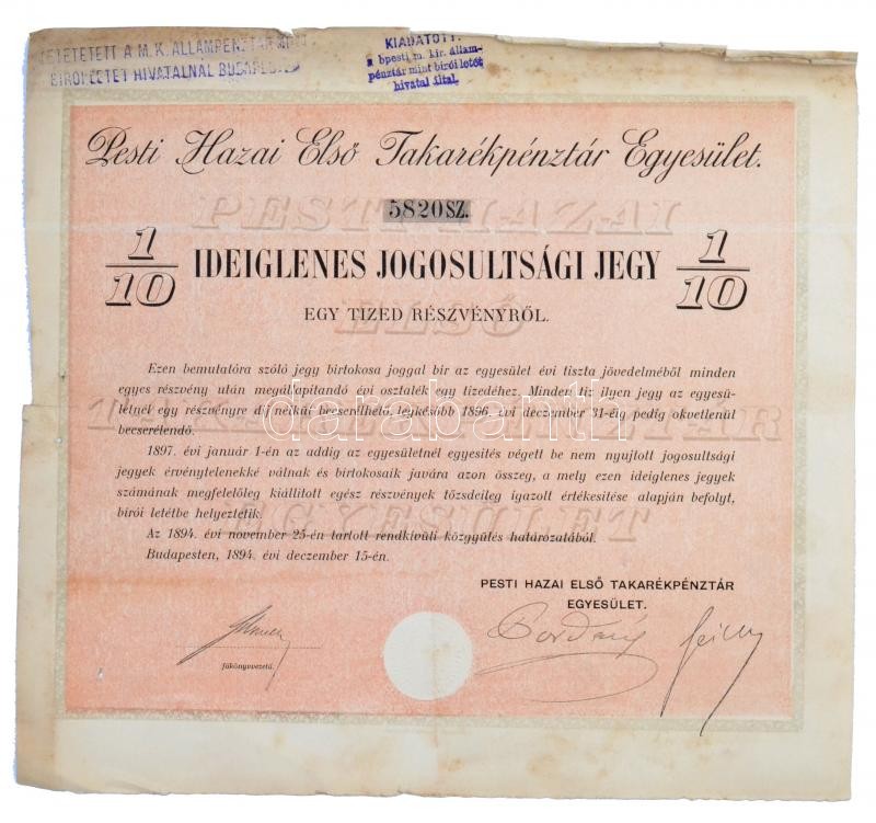 Budapest 1894. "Pesti Hazai Első Takarékpénztár-Egyesület" ideiglenes jogosultsági jegye 1/10 részvényről, felülbélyegzéssel, szárazpecséttel, hátulján írással T:III-