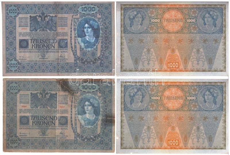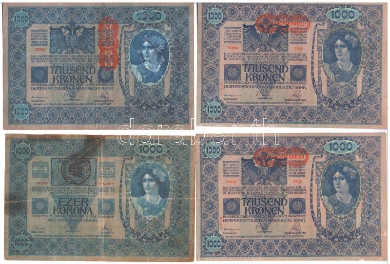 Beschreibung: 1902. 1000K (4x) közte 1db román felülbélyegzéssel, 2db mindkét oldal német, "Deutschösterreich" felülbélyegzéssel, sorszámkövetők T:I-,III- szakadt