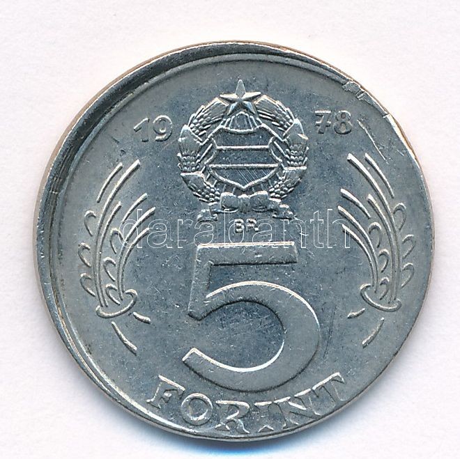 1978. 5Ft Cu-Ni technológiai hibás veret (félrecsúszott veret) T:1-,2 https://www.darabanth.com/de/363-Fernauktion/363.0/Numismatik/Ungarische-Munzen-und-Munzen-mit-ungarischem-Munzzeichen~2000008/1978-5Ft-Cu-Ni-technologiai-hibas-veret-felrecsuszott-veret-T1-2~II2100904
