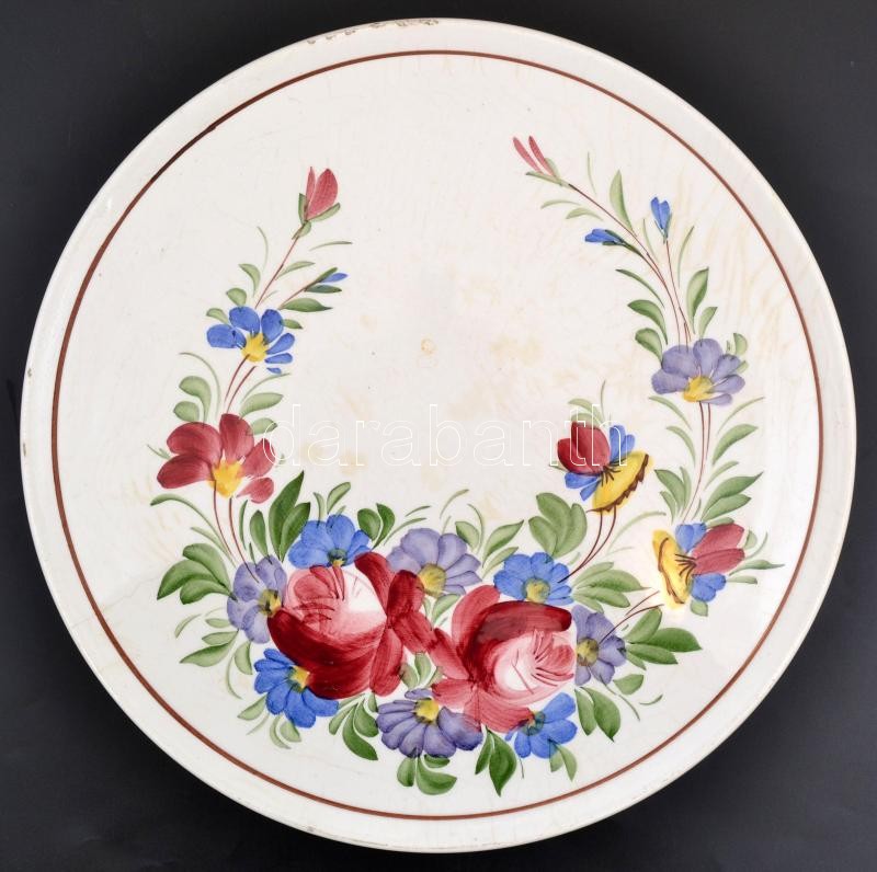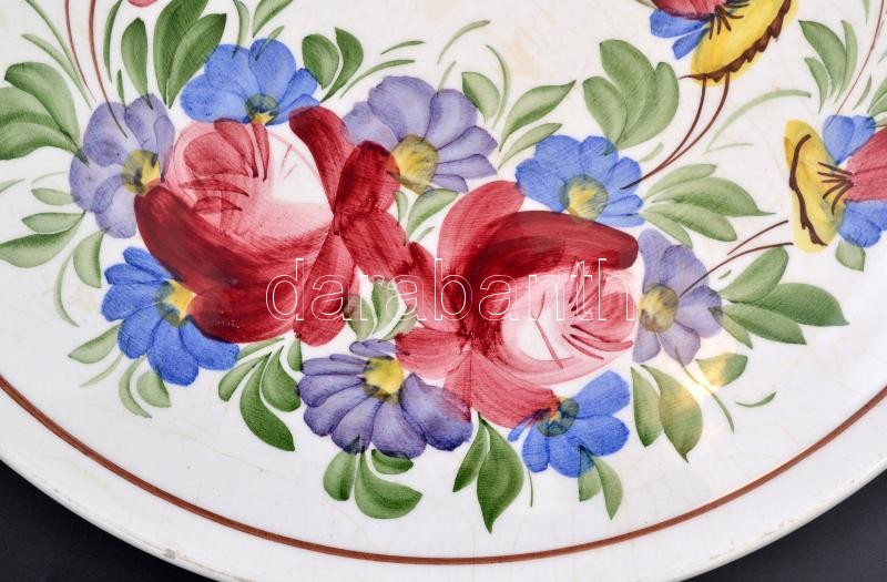 Beschreibung: Városlődi virágmintás kerámia tál, kézzel festett, jelzett, lepattanásokkal, d: 33 cm