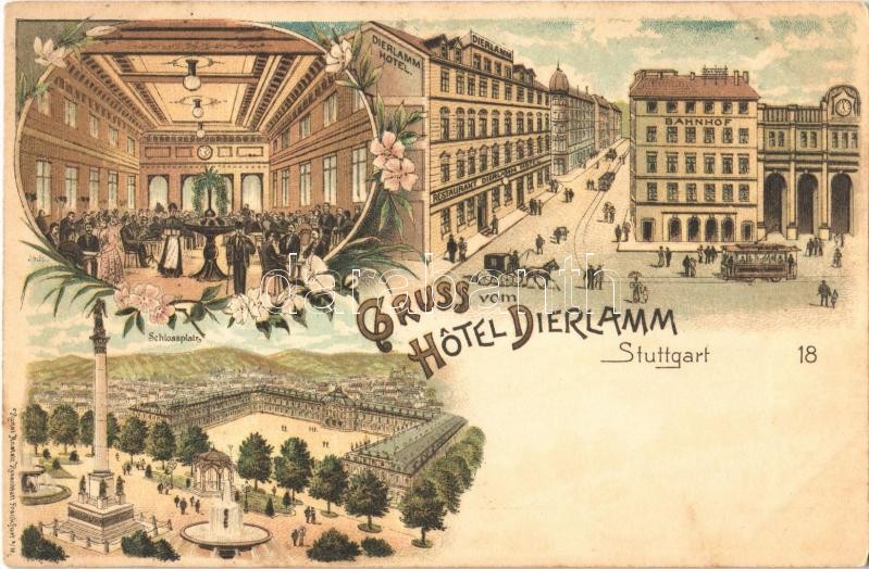 Beschreibung: Stuttgart, Hotel Dierlamm, Schlossplatz, Bahnhof / hotel interior, saquare, railway station. Kunstanstalt Rosenblatt Art Nouveau, floral, litho (fl)