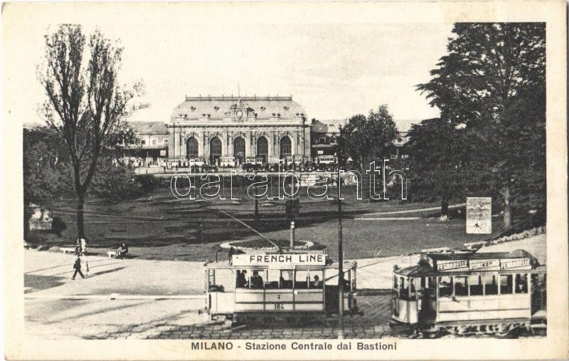 Milano, Milan; Stazione Centrale dai Bastioni / railway station, tram ... https://www.darabanth.com/de/364-Fernauktion/364.0/Ansichtskarten/Italien~1000041/Milano-Milan-Stazione-Centrale-dai-Bastioni-railway-station-tram-with-French-Line-advertisement~II2106153