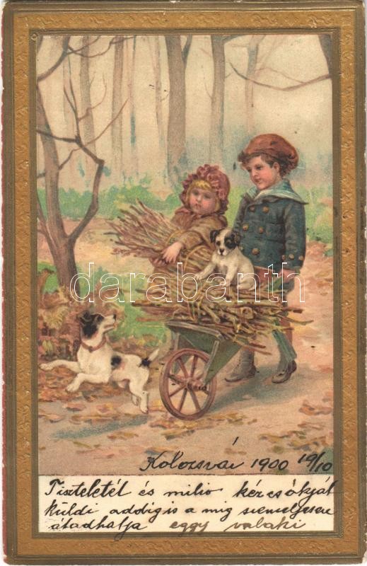 Beschreibung: 1900 Children with dogs. Winkler & Schorn Meisterbilder Serie Emb. litho (worn corners)