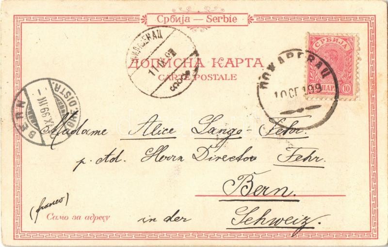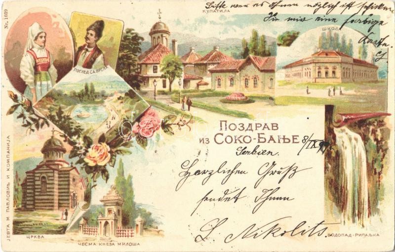 Beschreibung: 1899 Sokobanja, spa, Serbian church, fountain, waterfall, school, folklore. Art Nouveau, floral, litho (EK)