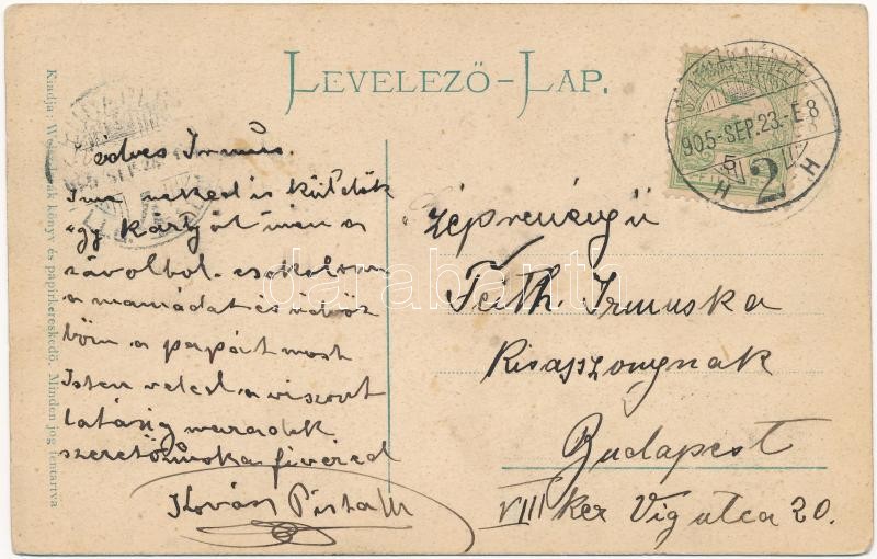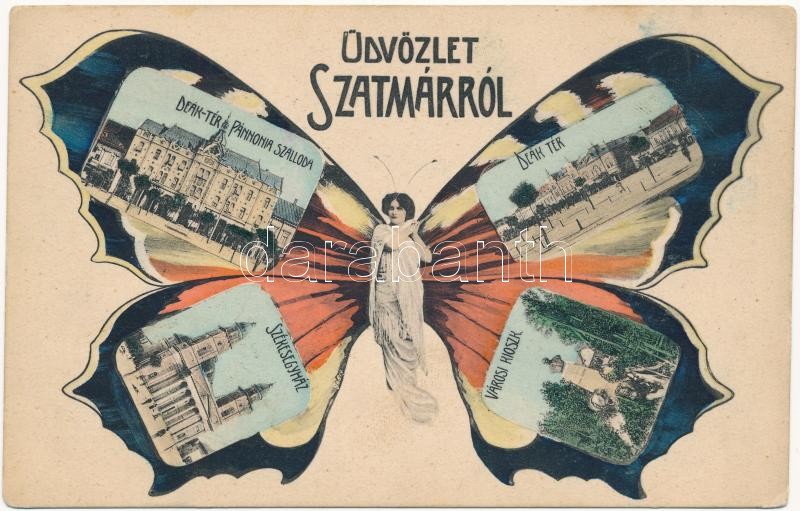 1905 Szatmárnémeti, Szatmár, Satu Mare; Deák tér, Pannonia szálloda, Székesegyház, Városi kioszk. Weisz Izsák kiadása. Szecessziós pillangós hölgy montázs művészlap / square, hotel, cathedral, restaurant, kiosk, monument. Art Nouveau butterfly lady montage art postcard