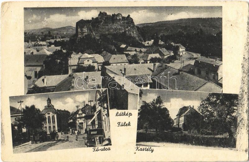 Beschreibung: 1944 Fülek, Filakovo; látkép, vár, Fő utca, automobil, Berchtold kastély / Filakovsky hrad / general view, castle, main street, automobile (EK)