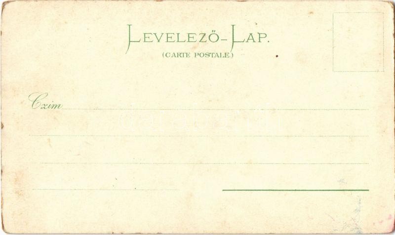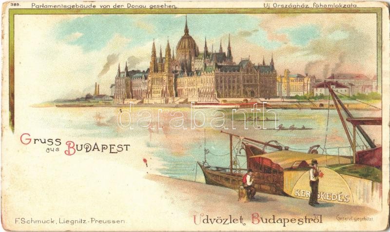 Budapest V. Új Országház főhomlokzata, evezős csónakok a Dunán, pesti rakpart "Kereskedés" hajóval. F. Schmuck 389. litho (kopott sarkak / worn corners)