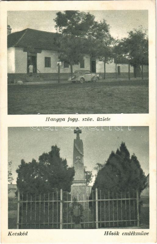 Beschreibung: Kecskéd, Hősök emlékműve, Hangya fogy. szöv. üzlete és saját kiadása, automobil (EK)