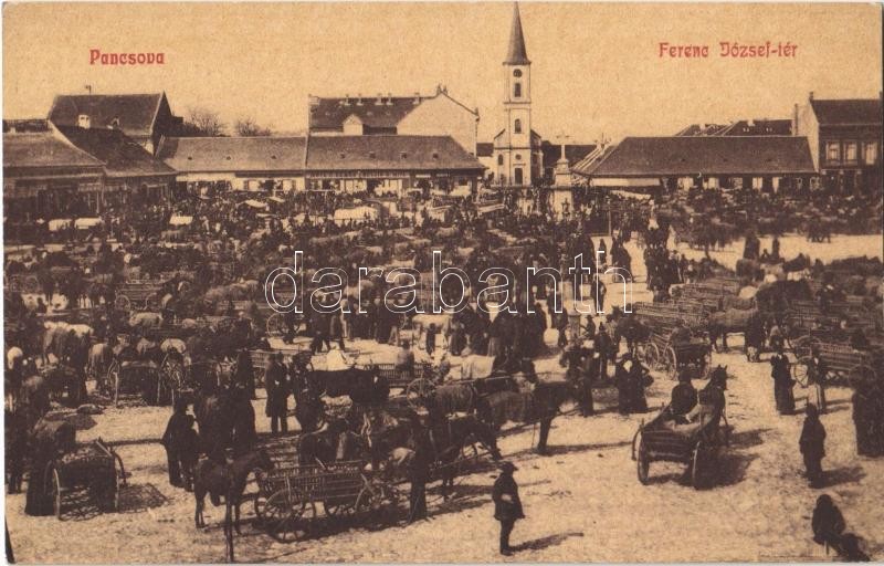 Pancsova, Pancevo; Ferenc József tér, piac, Németh J., Beljin S. Mita üzlete, templom, szekerek. W. L. 769. / square, market, shops, church, carriages