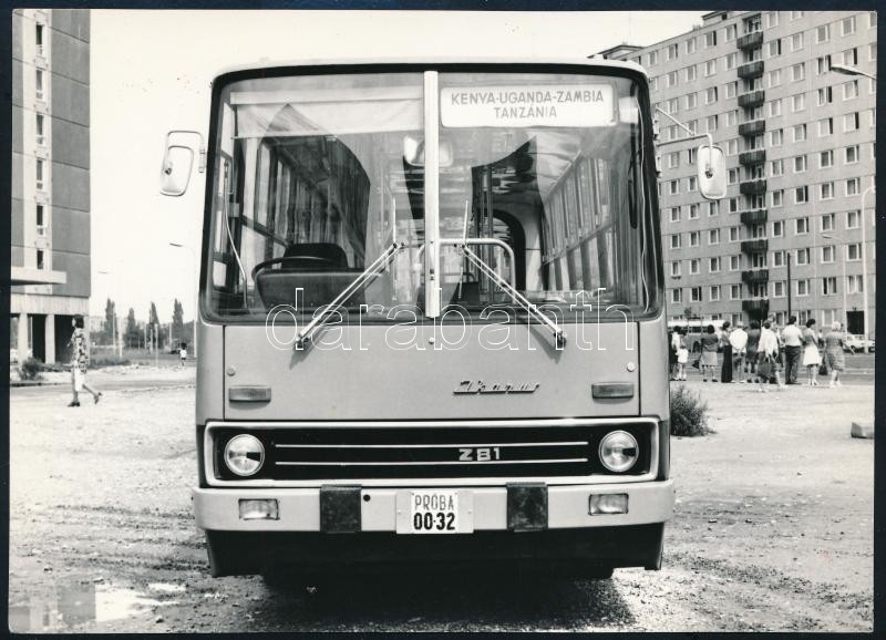 Beschreibung: 1978 Ikarus 281 jobbkormányos autóbusz gyári fotója "Kenya-Uganda-Zambia-Tanzánia", "Próba 00.32" rendszámmal, 'Ikarus Fotolabor' pecséttel, 12x17 cm