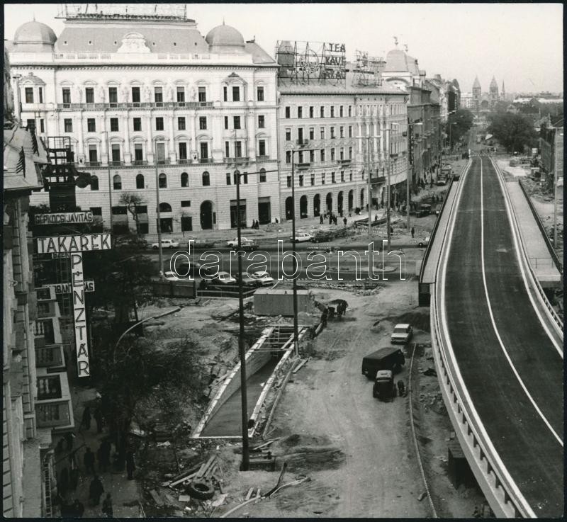 Beschreibung: 1980 Budapest, felszíni munkák és a felüljáró építése az egykori Marx (Nyugati) téren, fotó, 16×17 cm