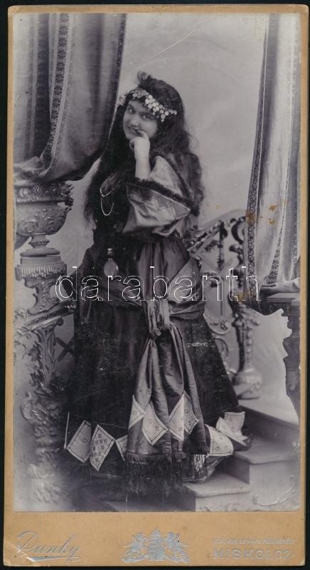 Beschreibung: cca 1890 Miskolc, a Dunky fivérek műtermében készült, keményhátú, vintage fotó, cigánylánynak öltözött naiva, 19,7x10,5 cm