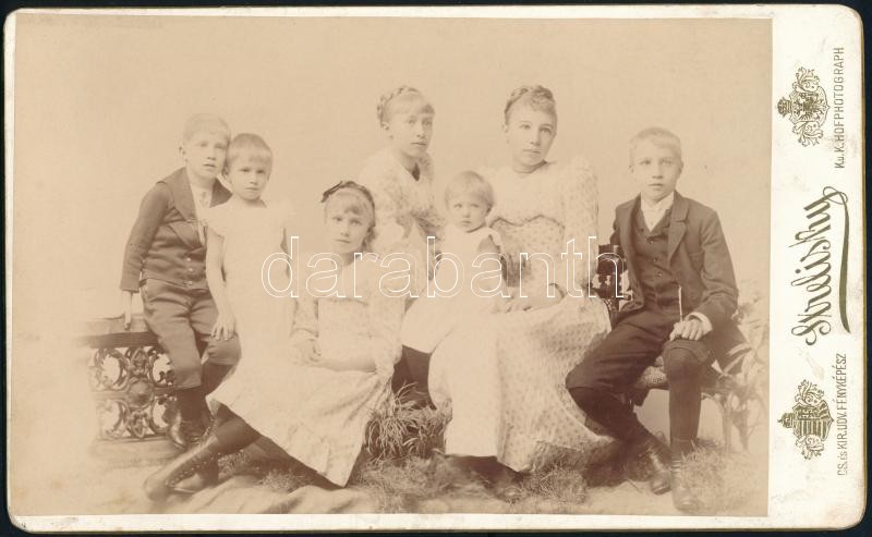 Beschreibung: cca 1900 Id. Walkó Lajos gyermekei (Endre, Loránd, Andrienne, Gizella, Irén, Amália, Lajos), keményhátú fotó Strelisky műterméből, 13×21 cm