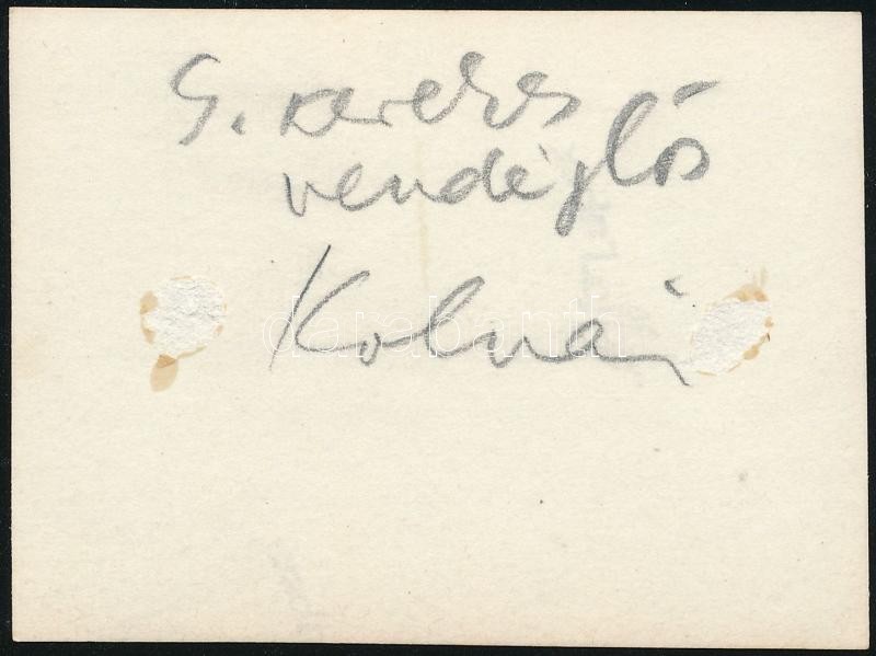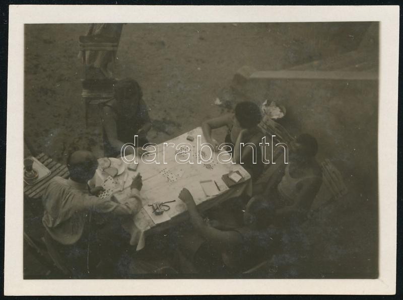 cca 1934 Kinszki Imre (1901-1945) budapesti fotóművész hagyatékából jelzés nélküli, de a szerző által feliratozott, vintage fotó (Kártyaparti a standon), 4,6x6,2 cm