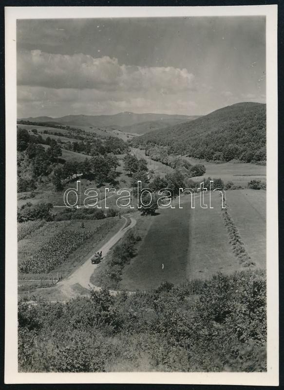 Beschreibung: cca 1935 Kinszki Imre (1901-1945) budapesti fotóművész hagyatékából jelzés nélküli vintage fotó (Tájkép lovaskocsival), 8,6x6,2 cm