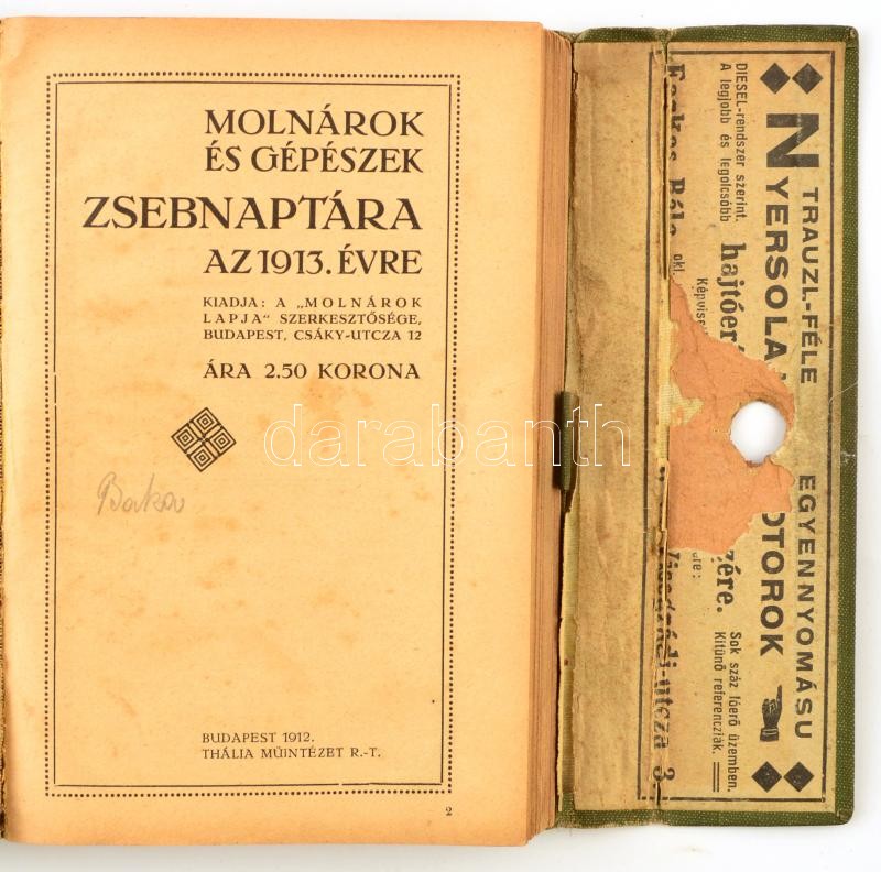1913 Molnárok, gépészek zsebnaptára kissé sérült egészvászon kötésben https://www.darabanth.com/de/364-Fernauktion/364.0/Kunst-Dokumente-andere-Sammelgebiete/Drucksachen~500029/1913-Molnarok-gepeszek-zsebnaptara-kisse-serult-egeszvaszon-kotesben~II2081509
