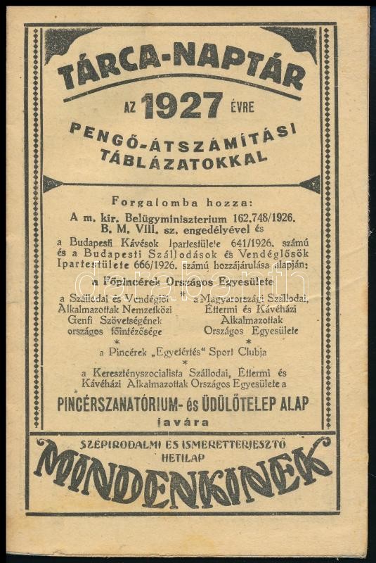 1927 Tárcanaptár pengőátszámítási táblázatokkal, kiadja: Szépirodalmi ... https://www.darabanth.com/de/364-Fernauktion/364.0/Kunst-Dokumente-andere-Sammelgebiete/Drucksachen~500029/1927-Tarcanaptar-pengoatszamitasi-tablazatokkal-kiadja-Szepirodalmi-es-IsmeretterjesztC5~II2104074