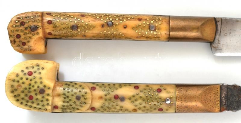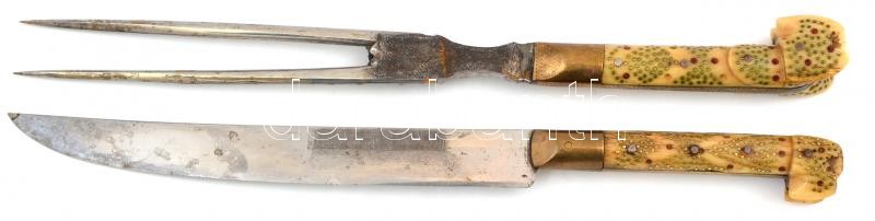 Beschreibung: Csontnyelű húsvilla és kés, az egyiken "Sarajevo 1886" felirattal, egyik sérült, h: 32 cm