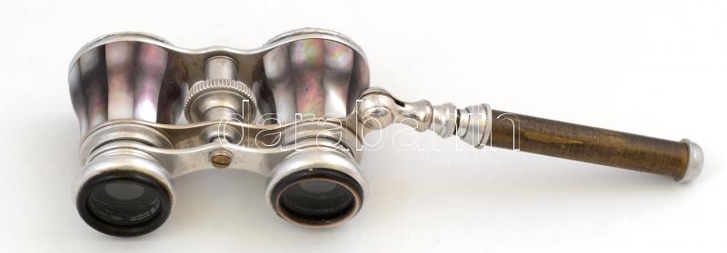 Beschreibung: Gyöngyház díszítésű nyeles színházi látcső, működik, kopásnyomokkal, 10×6,5 cm