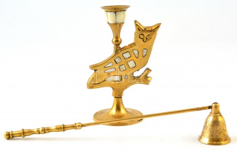 Beschreibung: Gyöngyház díszítésű réz gyertyatartó + réz koppintó, m: 15 cm, h: 25 cm