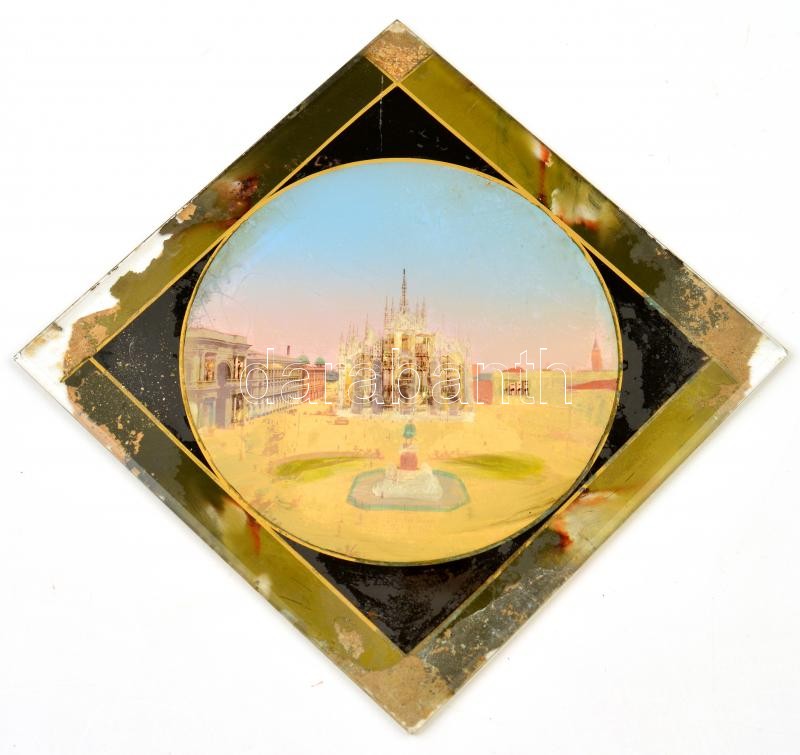 Beschreibung: Milánó, Főtér, régi kézzel színezett üvegkép, kopott, 12x12 cm
