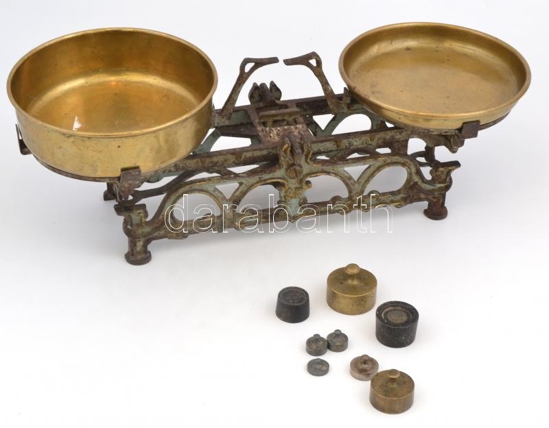 Öntött fém asztali mérleg réz tányérokkal és réz súlyokkal. 40 cm https://www.darabanth.com/de/364-Fernauktion/364.0/Kunst-Dokumente-andere-Sammelgebiete/Flohmarkt~500011/Ontott-fem-asztali-merleg-rez-tanyerokkal-es-rez-sulyokkal-40-cm~II2107705