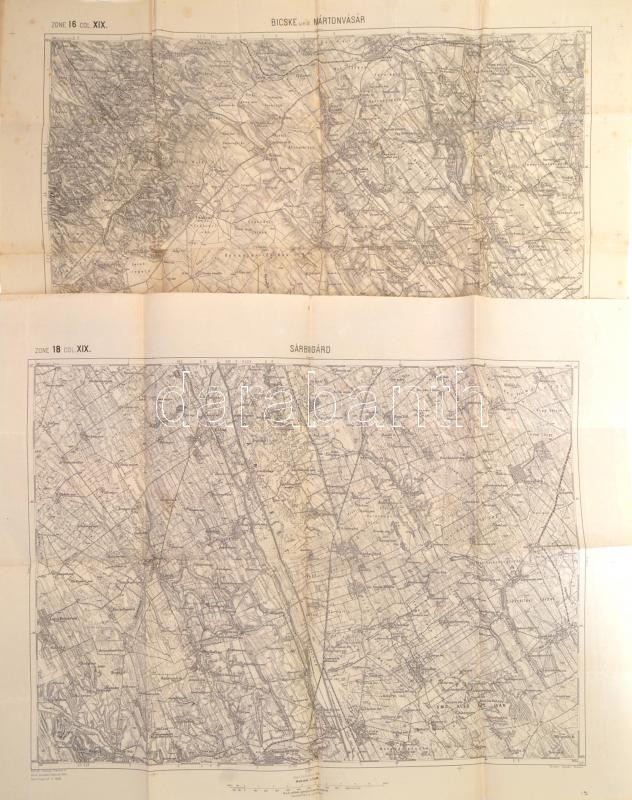 Beschreibung: 1885-1899 Sárbogárd, Bicske, Martonvásár környékének katonai térképe, 2 db, szakadással, 46×56 cm