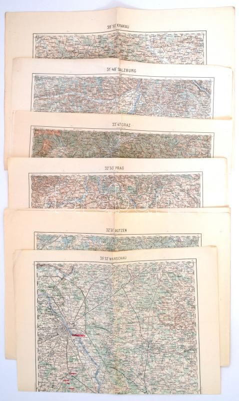 Beschreibung: 1913-1915 6 db katonai térkép (Salzburg, Prága, Graz, Krakkó, stb.), kiadja: K. u. k. Militärgeographisches Institut
