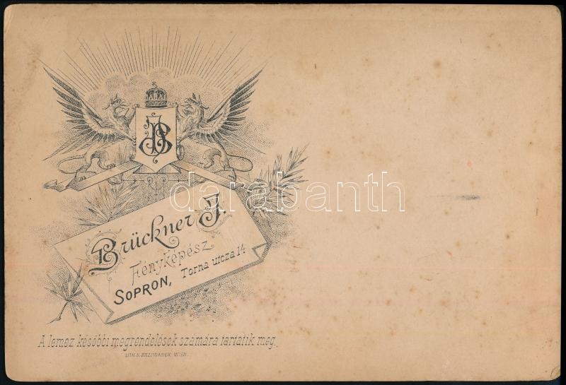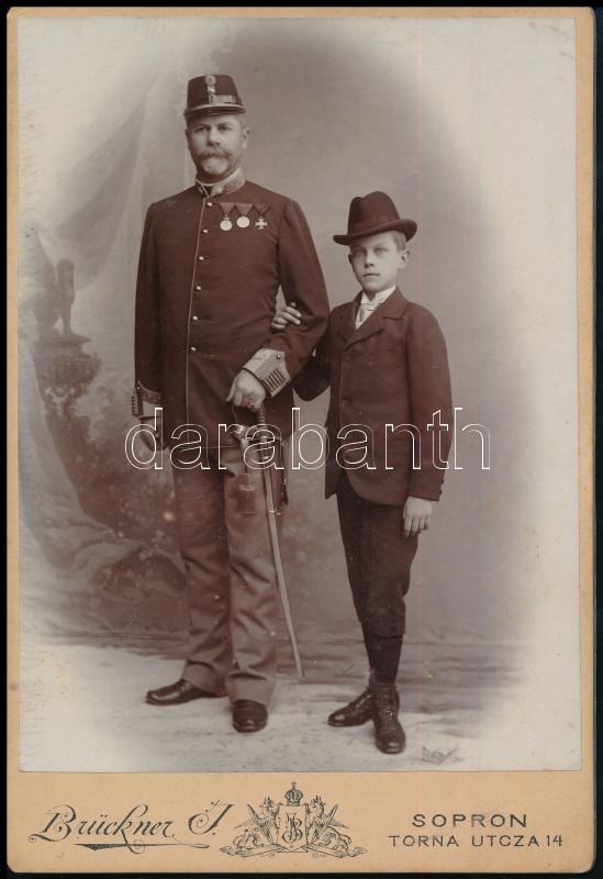 cca 1900 Éder Pál (1849-1916) őrnagy keményhátú portréfotója, fiával, Éder Győző/Viktorral, (1890-1980), későbbi huszártiszttel, a brassói cs. és kir. 2. huszárezred későbbi tagjával, Sopron, Brückner J., 16x11 cm közötti méretben