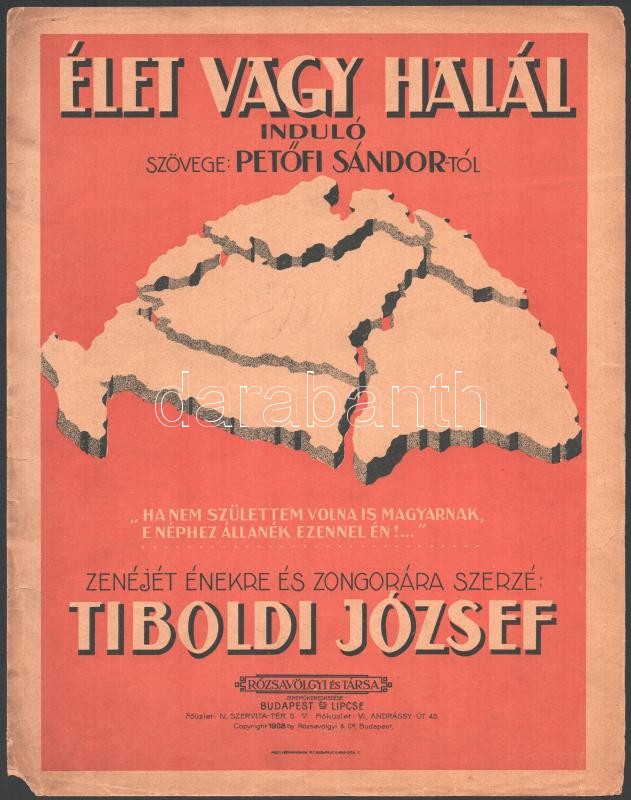 1928 Tiboldi József: Élet vagy halál. Induló. Szöveg: Petőfi Sándor. I... https://www.darabanth.com/de/364-Fernauktion/364.0/Kunst-Dokumente-andere-Sammelgebiete/Musik-Noten~500031/1928-Tiboldi-Jozsef-Elet-vagy-halal-Indulo-Szoveg-Petofi-Sandor-Irredenta-kotta-Bp-19~II2107537