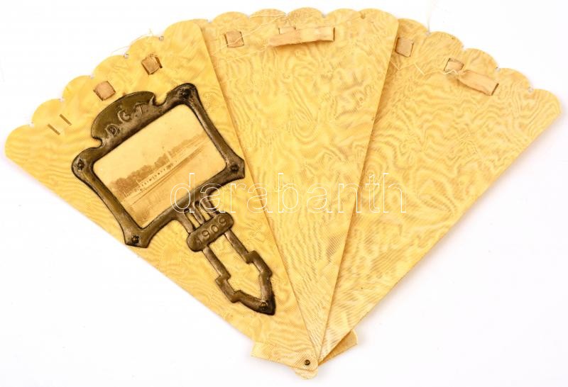Beschreibung: cca 1900 A DGT Dunagőzhajózási Társaság szecessziós legyezője fém rátéttel, egy hajó fényképével. Szétjött selyem szalag. m: 18 cm