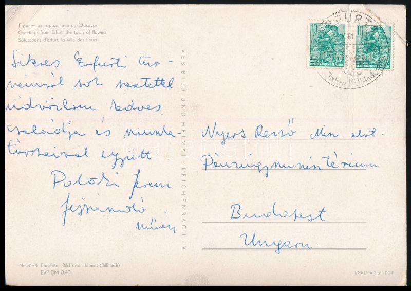Beschreibung: 1961 Erfurt, Pataki Ferenc (1921-2017) fejszámoló művész saját kézzel írt képeslapja Nyers Rezsőnek.