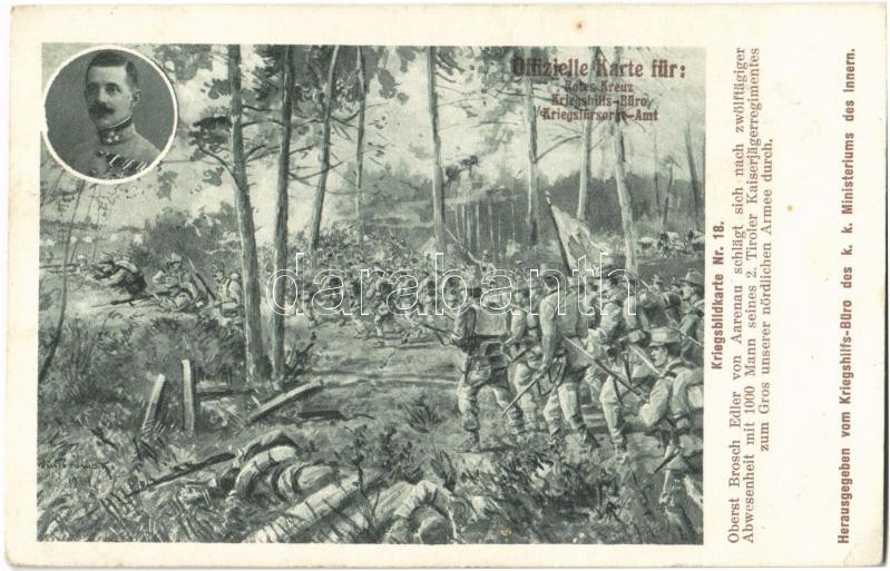 1914 Kriegsbildkarte Nr. 18. Oberst Brosch Edler von Aarenau schlägt sich nach zwölftägiger Abwesenheit mit 1000 Mann seines 2. Tiroler Kaiserjägerregimentes zum Gros unserer nördlichen Armee durch. Kriegshilfsbüro / WWI Austro-Hungarian K.u.K. military art postcard. Colonel Brosch Edler von Aarenau s: Wintorowski (EK)